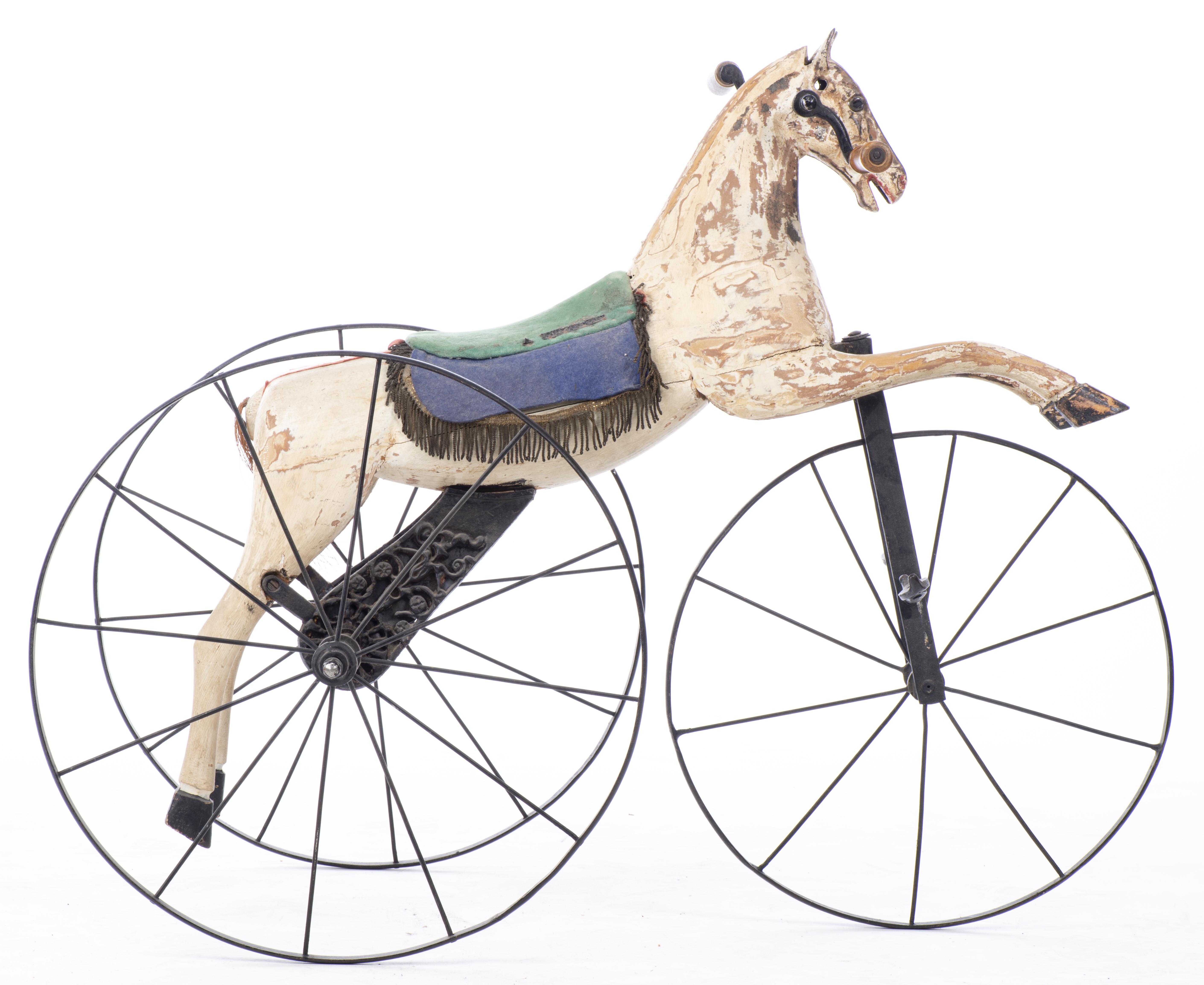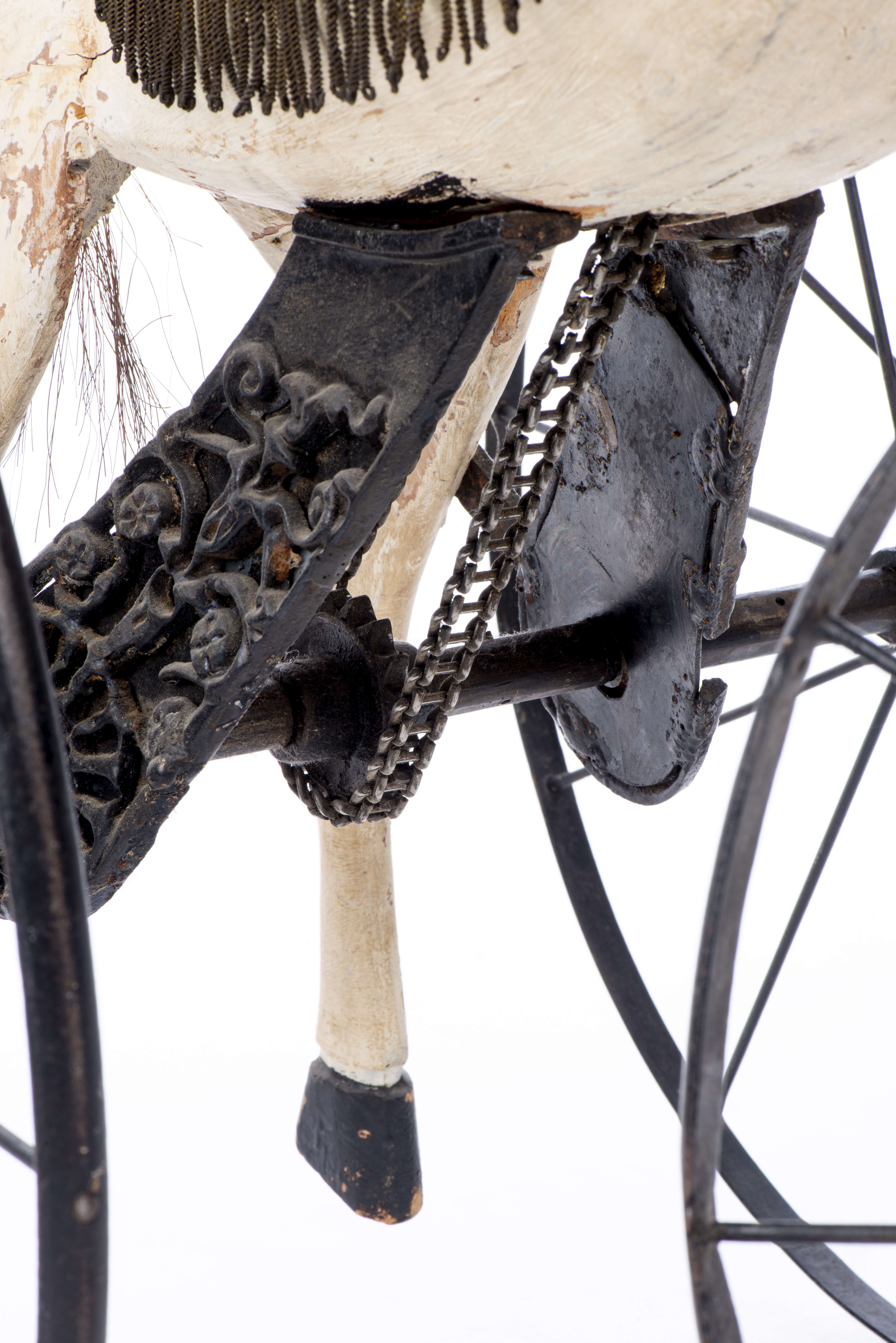 Travail fin XIXe début XXe, tricycle cheval en fonte, fer forgé et bois peint.
