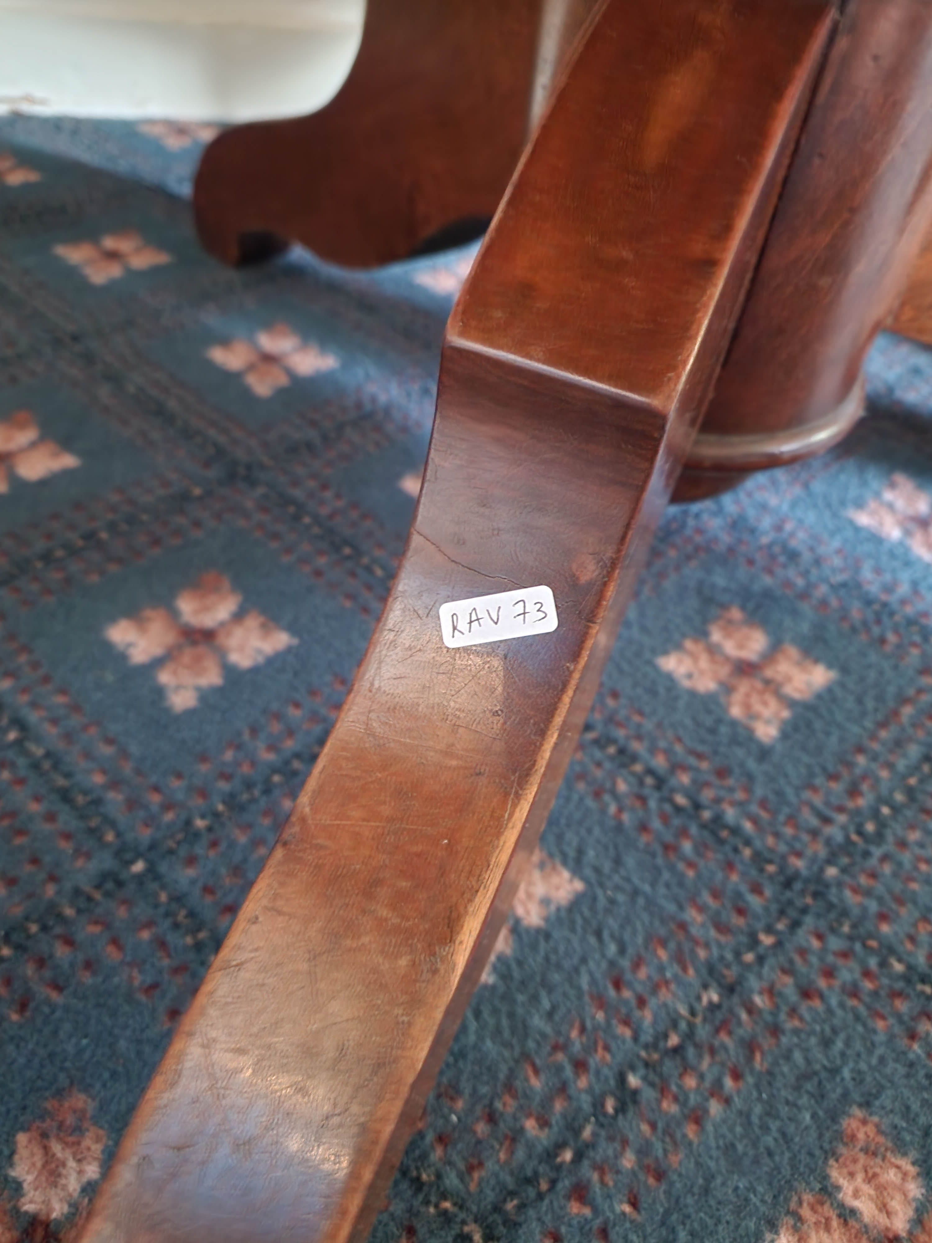 Table circulaire en bois massif. Fût central et piètement quadripode.