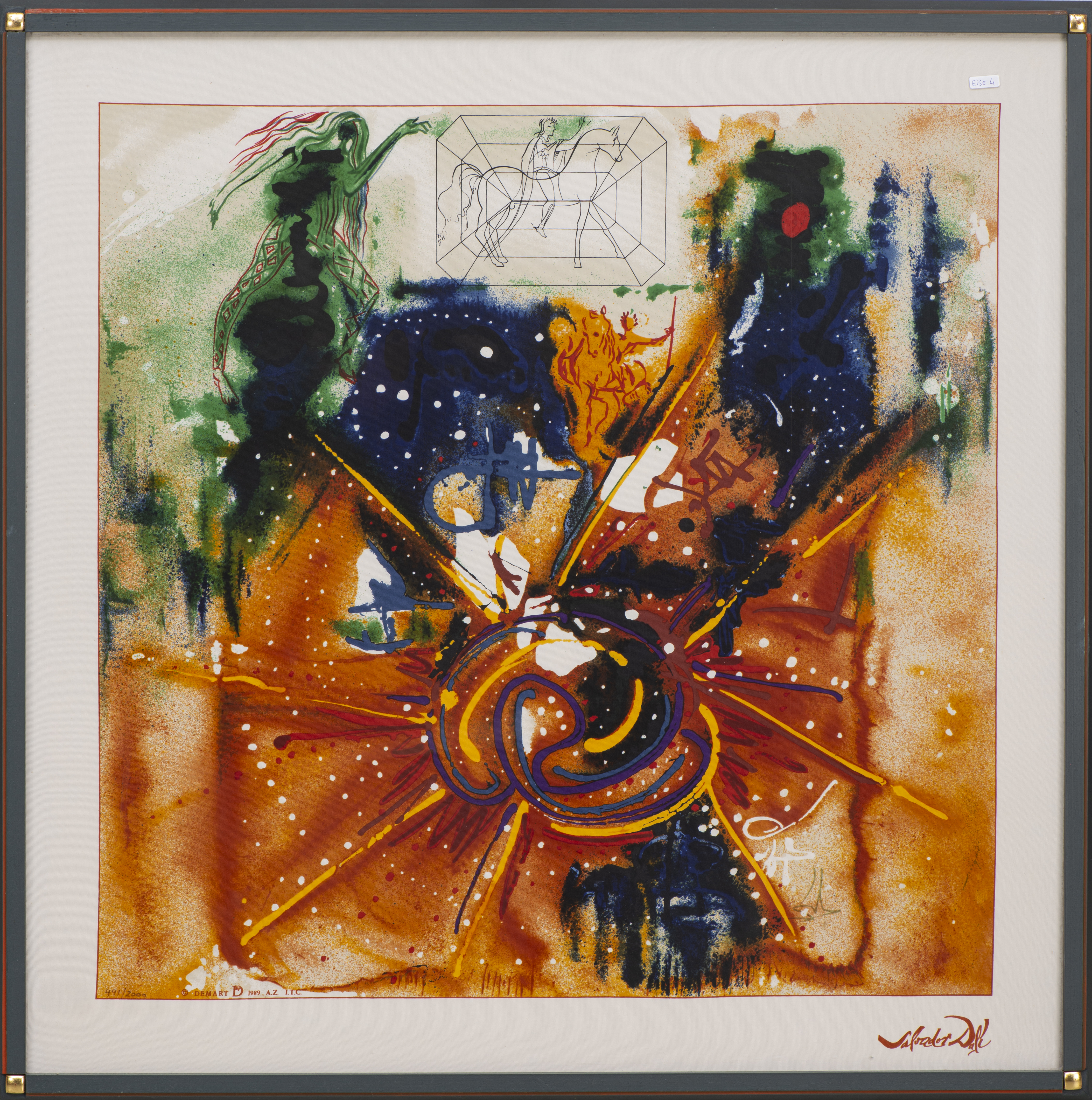 Salvador DALI (1904-1989), d'après composition surréaliste, ensemble de deux foulards imprimés encadrés, édition DEMART 1989, signé dans la planche et numéroté 187/2000 et 491/2000.