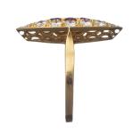 Bague navette en or jaune .750 ornée au centre de 4 rubis ronds pesant au total .40 ct et entouré de 12 diamants de taille brillant pesant 1.20 ct.