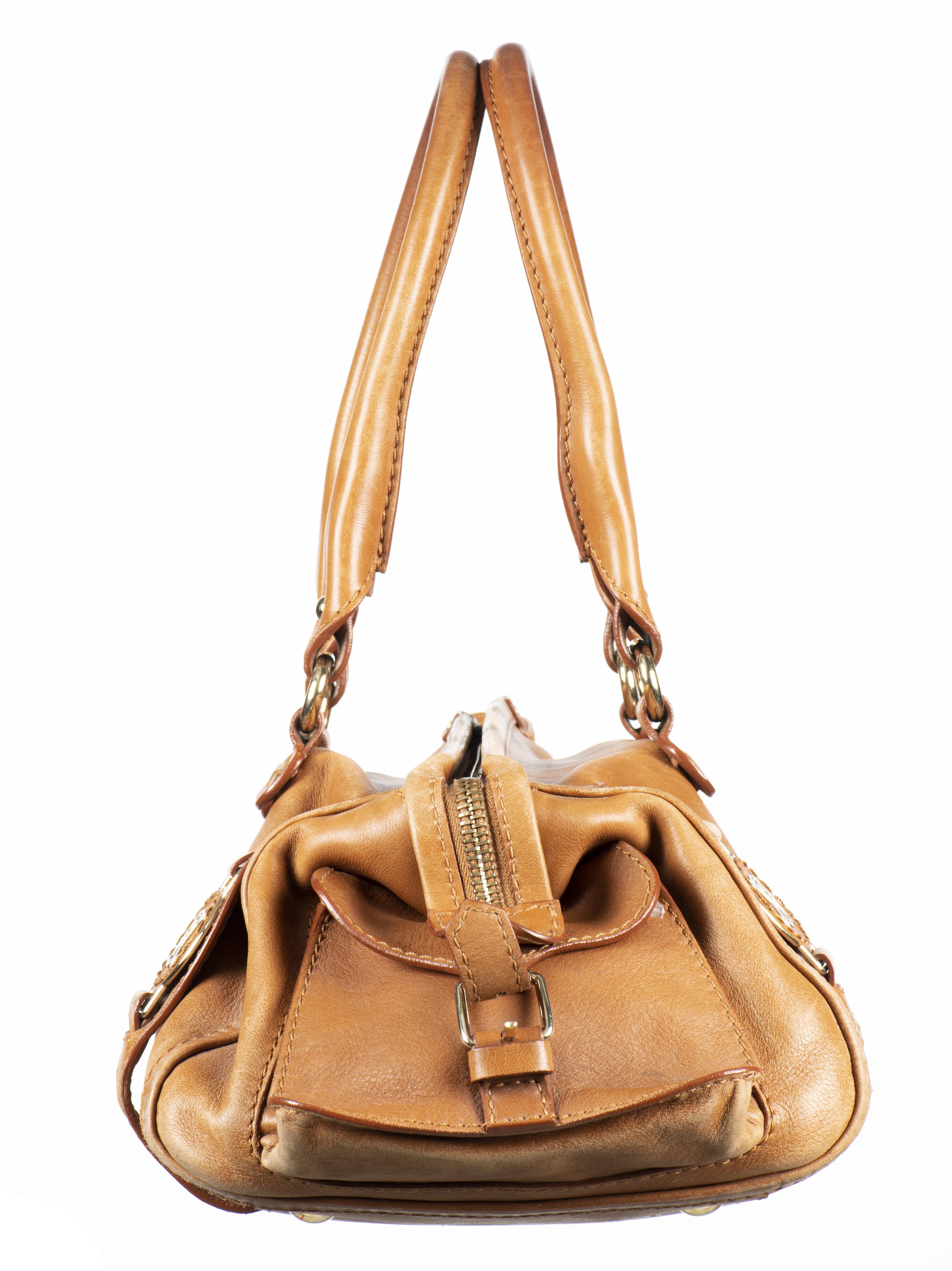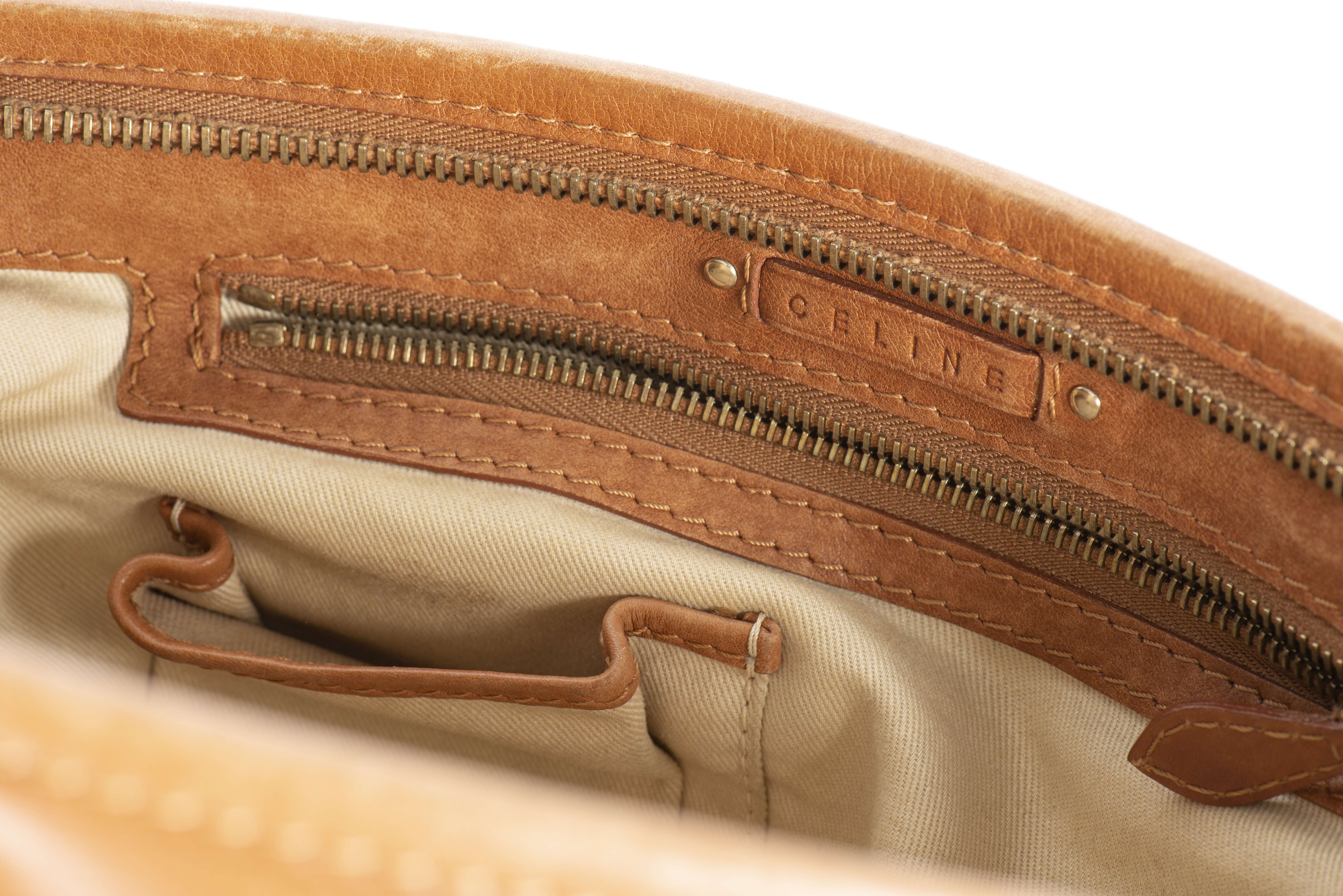 CELINE shoulder bag en cuir fauve à surpiqûre fauve, deux poignées, poche intérieure zippée deux poches latérales extérieures