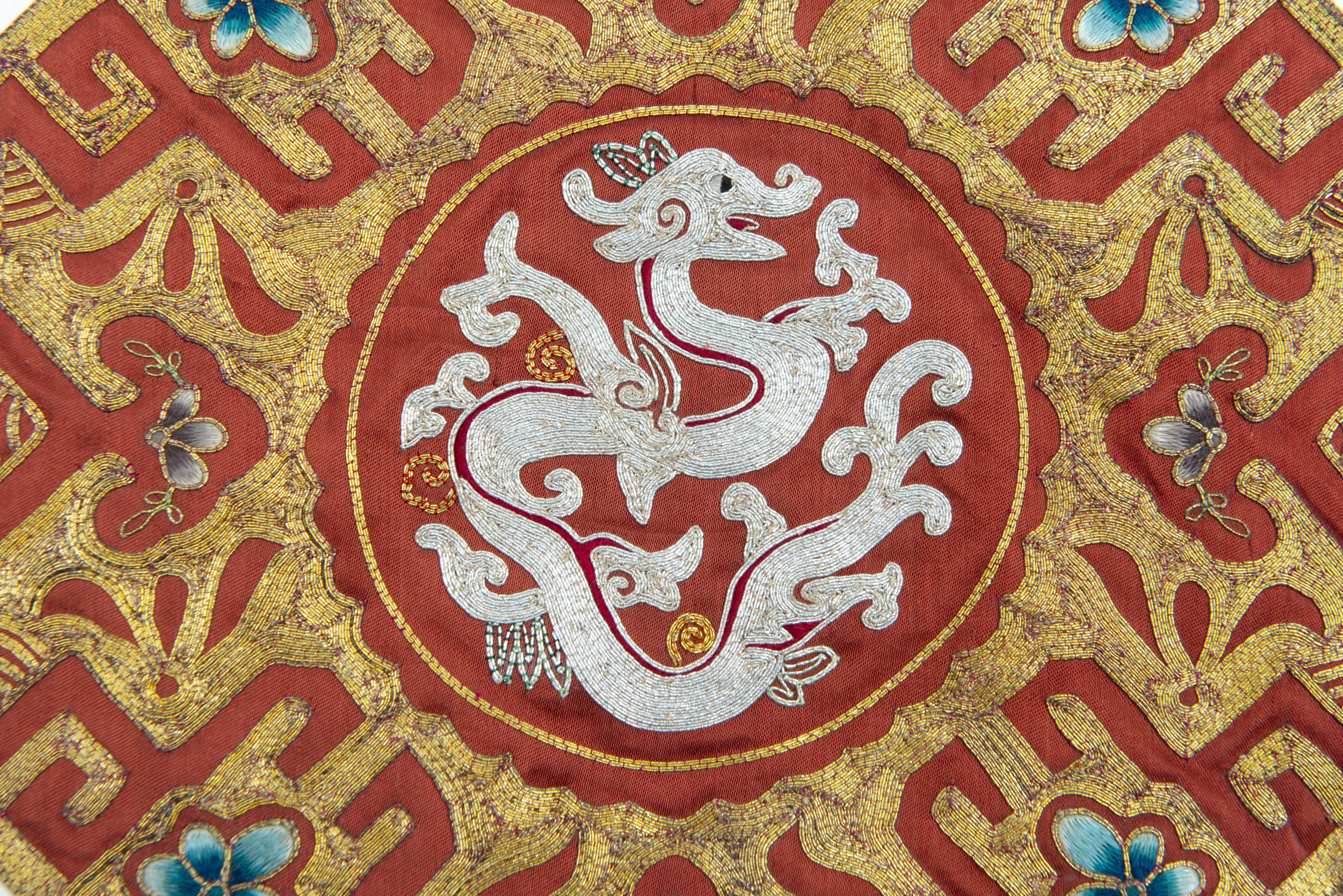 CHINE - 3 carrés octogonaux en soie et broderie de fil de métal avec un chilong argenté au centre