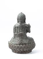 CHINE - Bouddha Amoghashiddhi en bronze à patine noir sur un socle à trois rangs de pétales de lotus, la main droite en vitarka-mudra