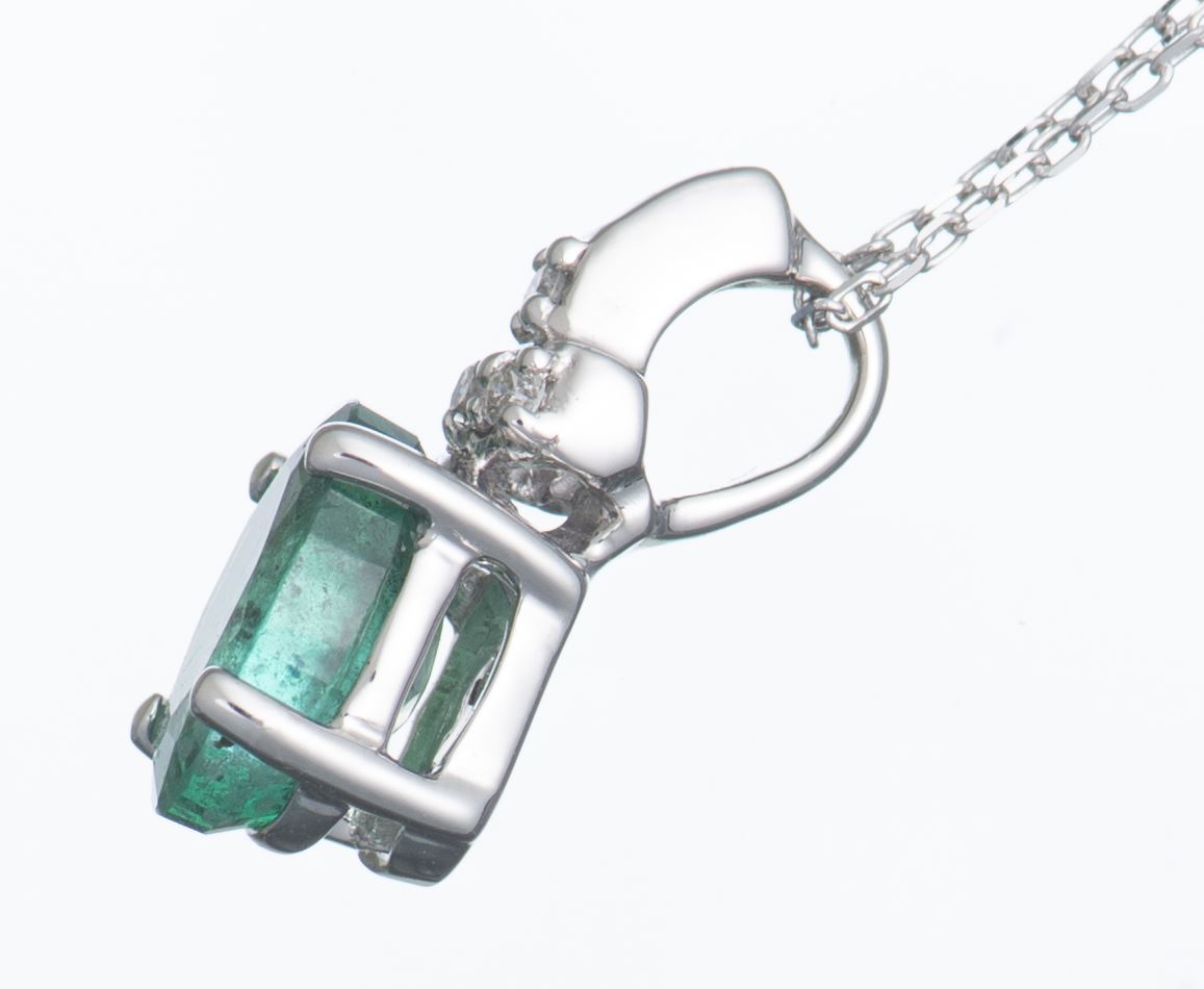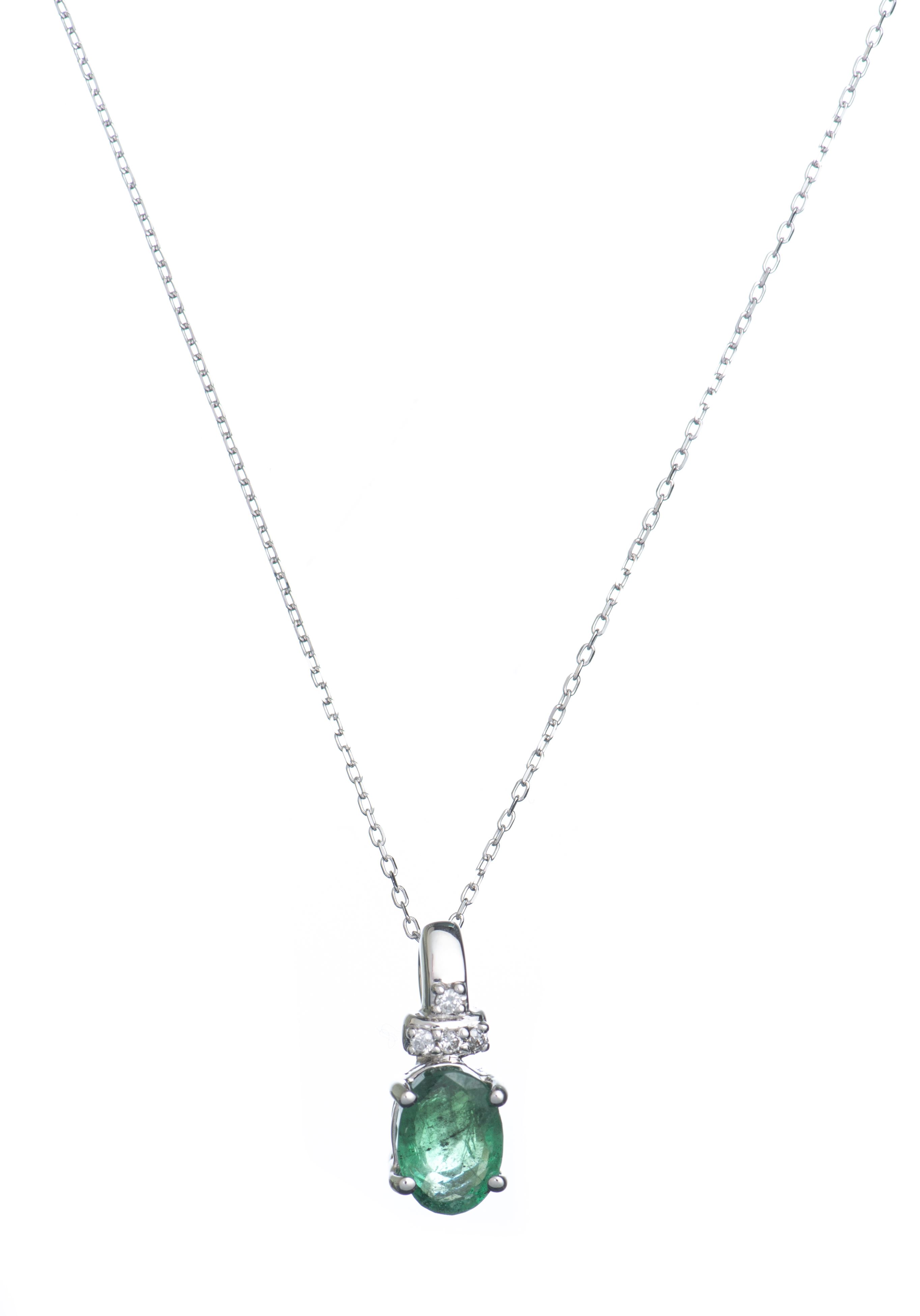 Collier en or gris .750 avec un pendentif émeraude pour 0.87 ct serti de 2 diamants de taille brillant pour un total de 0.03 ct.