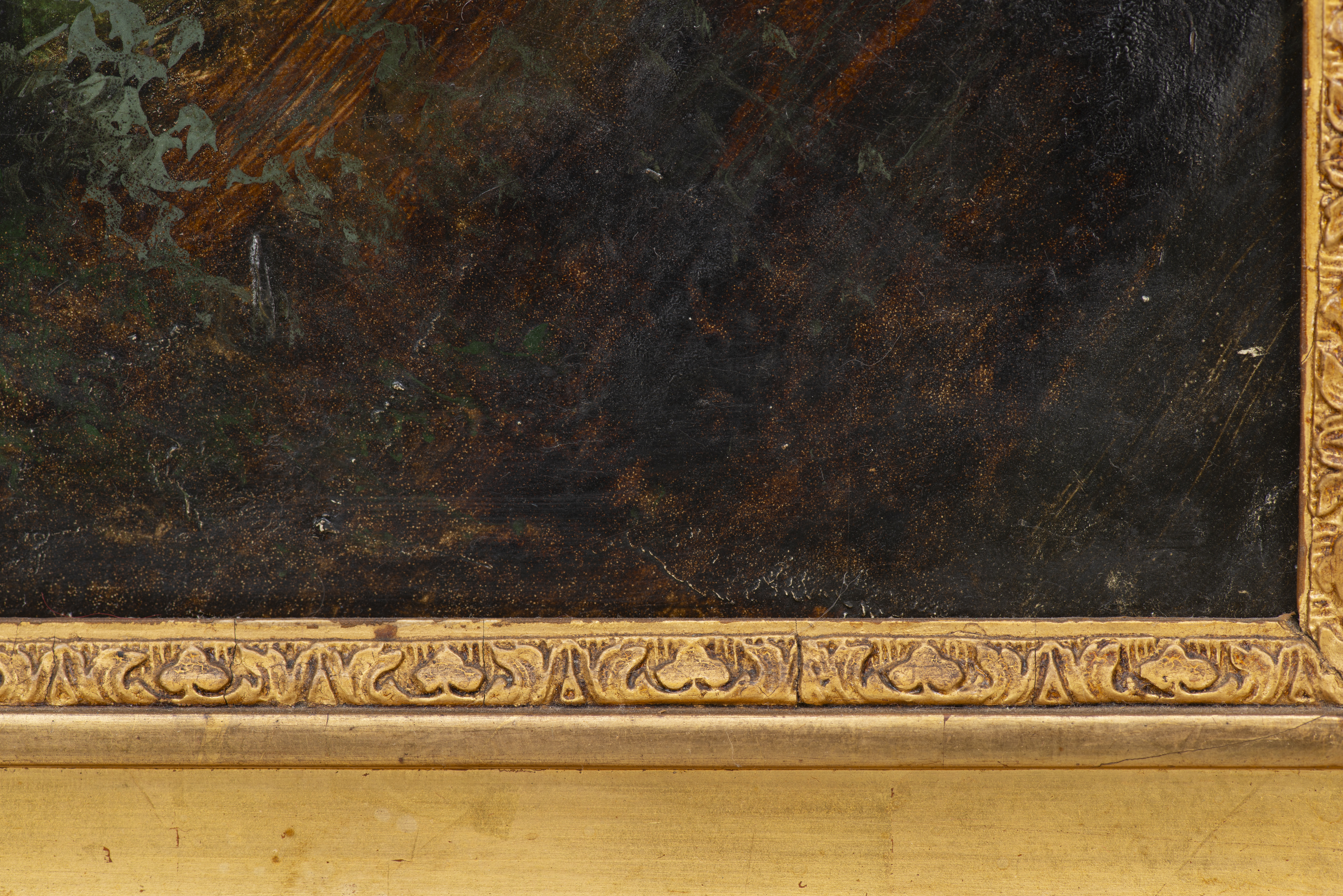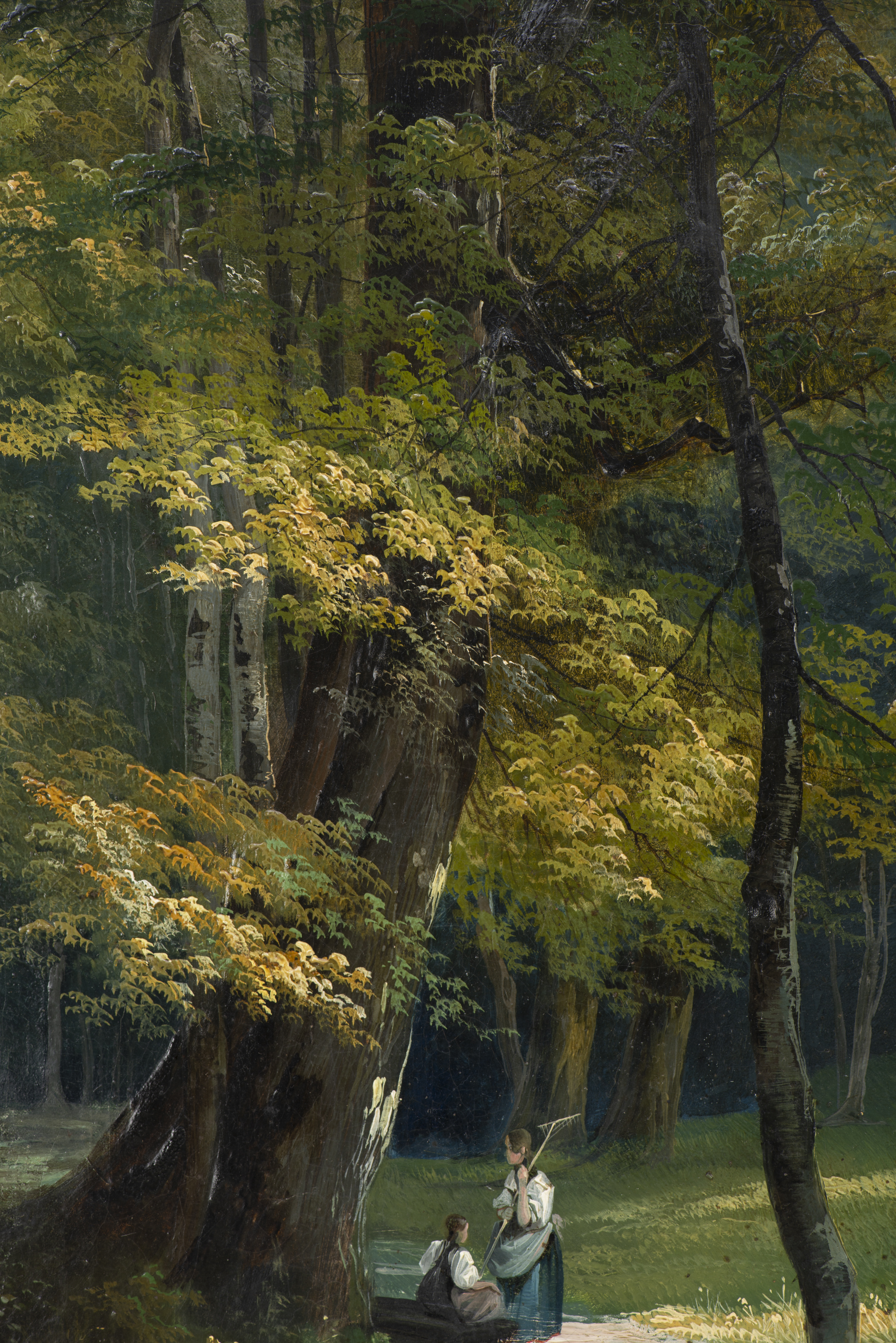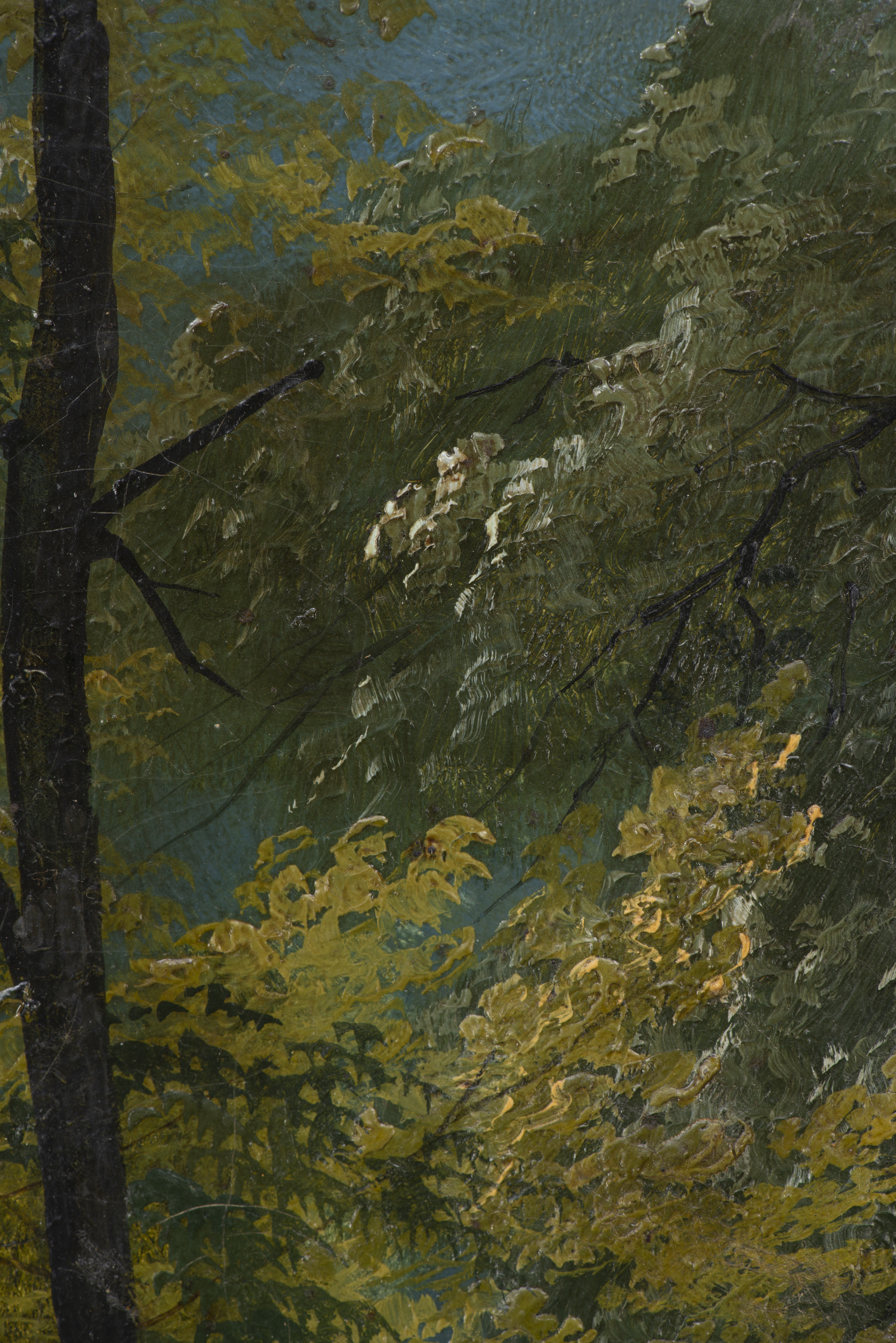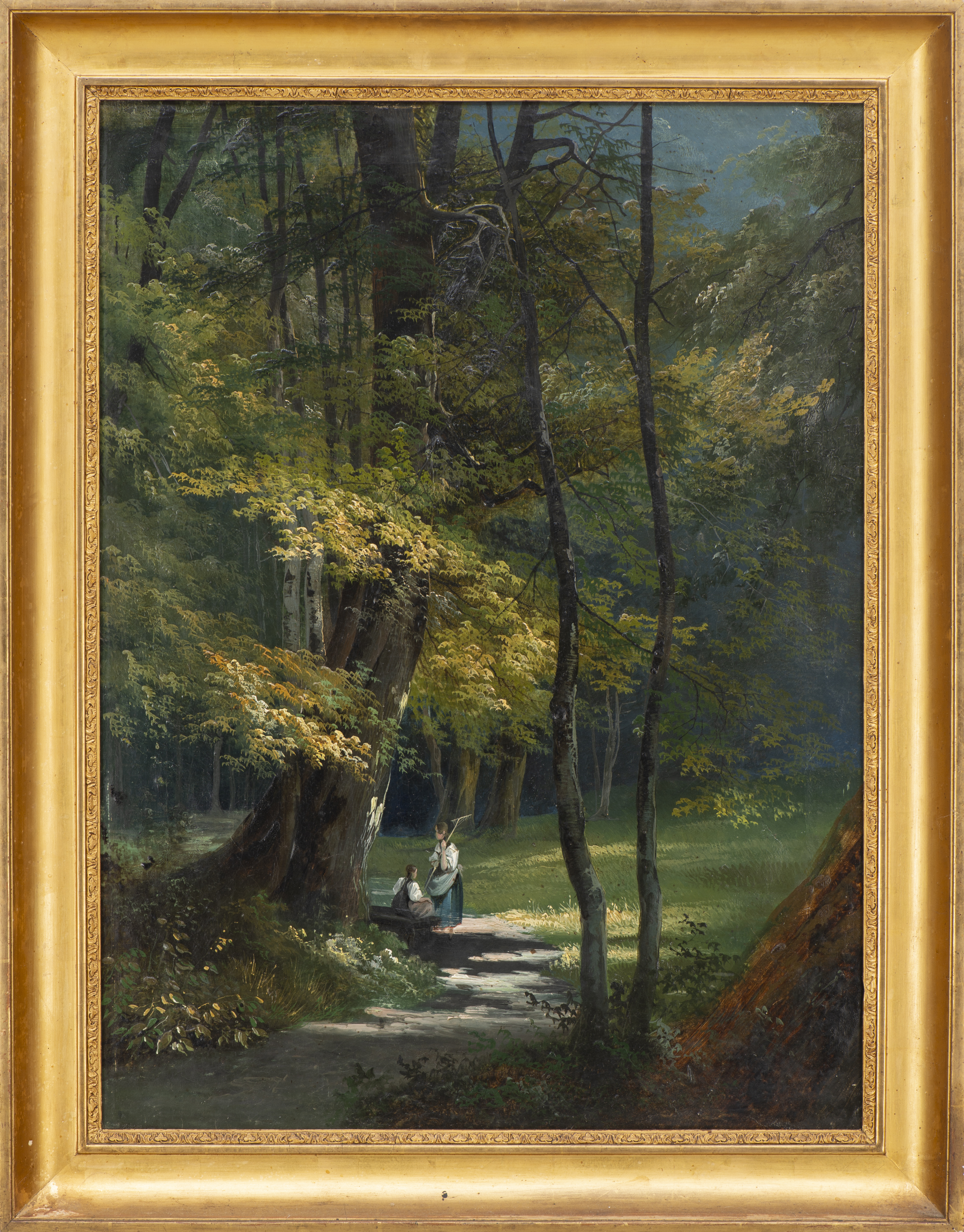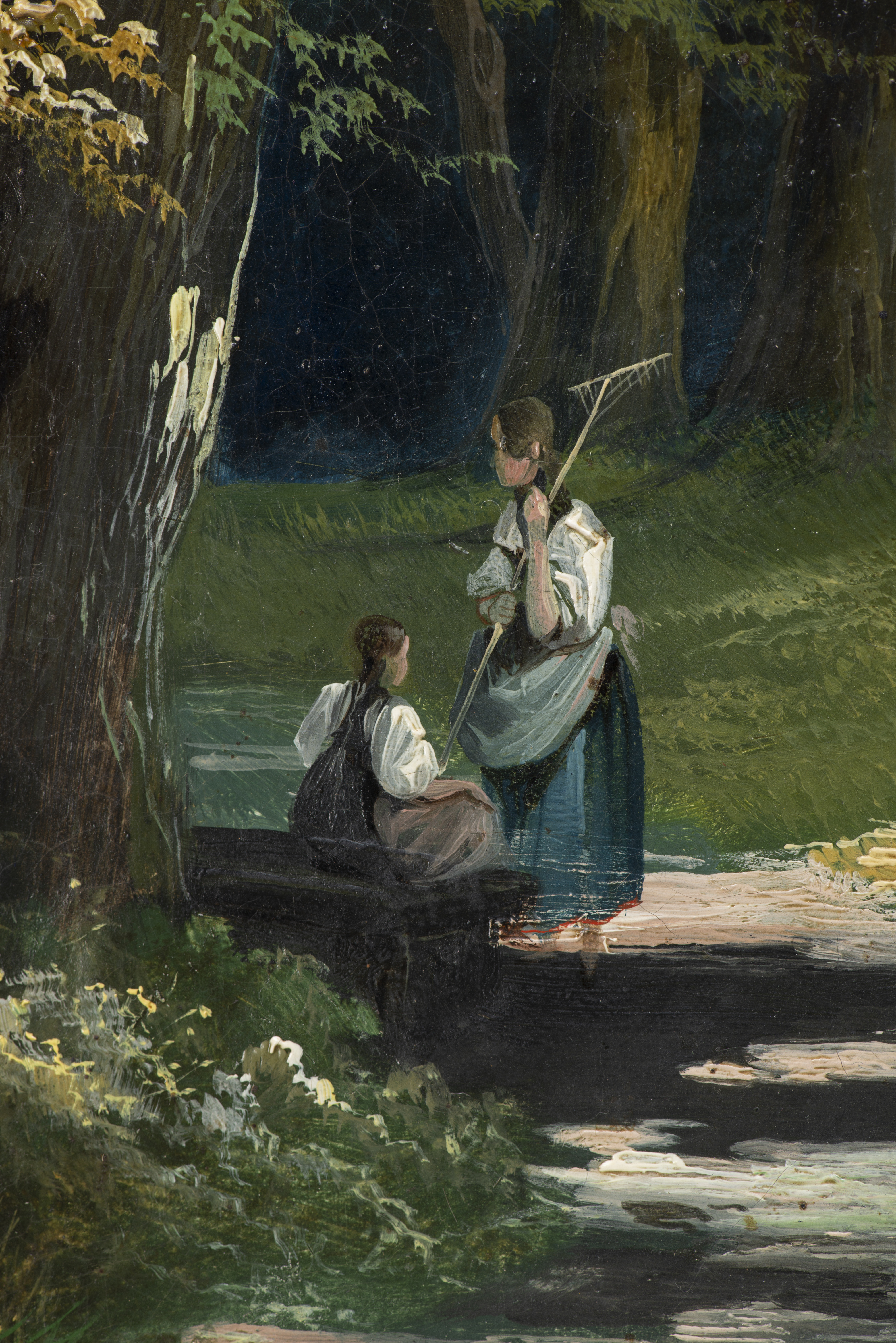 Ecole suisse du XIXe, "Paysannes dans un sous- bois", huile