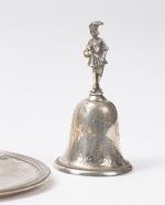 On y joint 1 clochette de table en argent 900 à prise en forme d'un courtisan tenant un couteau de sa main gauche et un livre dans sa main droite contre son torse.