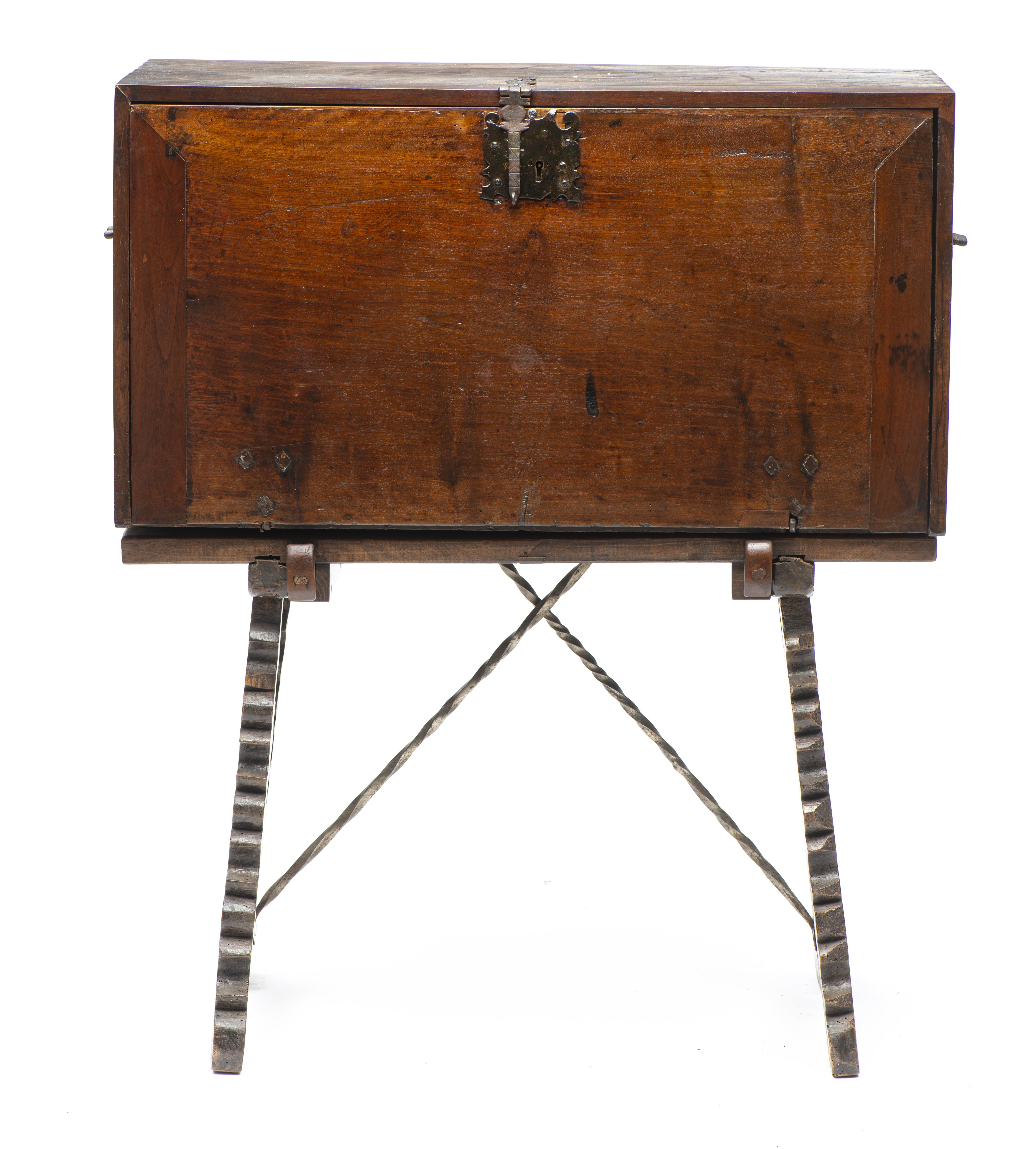 ESPAGNE - Cabinet dit "Bargueño" du XVIIe, en noyer, ouvrant par un abattant découvrant douze tiroirs et deux portillons à gonds en fer. Les parties claires et l'intérieur des tiroirs sont en sapin, l'extérieur et les parties foncées sont en noyer. Niche centrale architecturée de colonnettes cannelées et d'une corniche arrondie en bois cachant un tiroir secret. Entablement à trétaux en H découpés en croissants de lune maintenus par deux entretoises en fer forgé.
