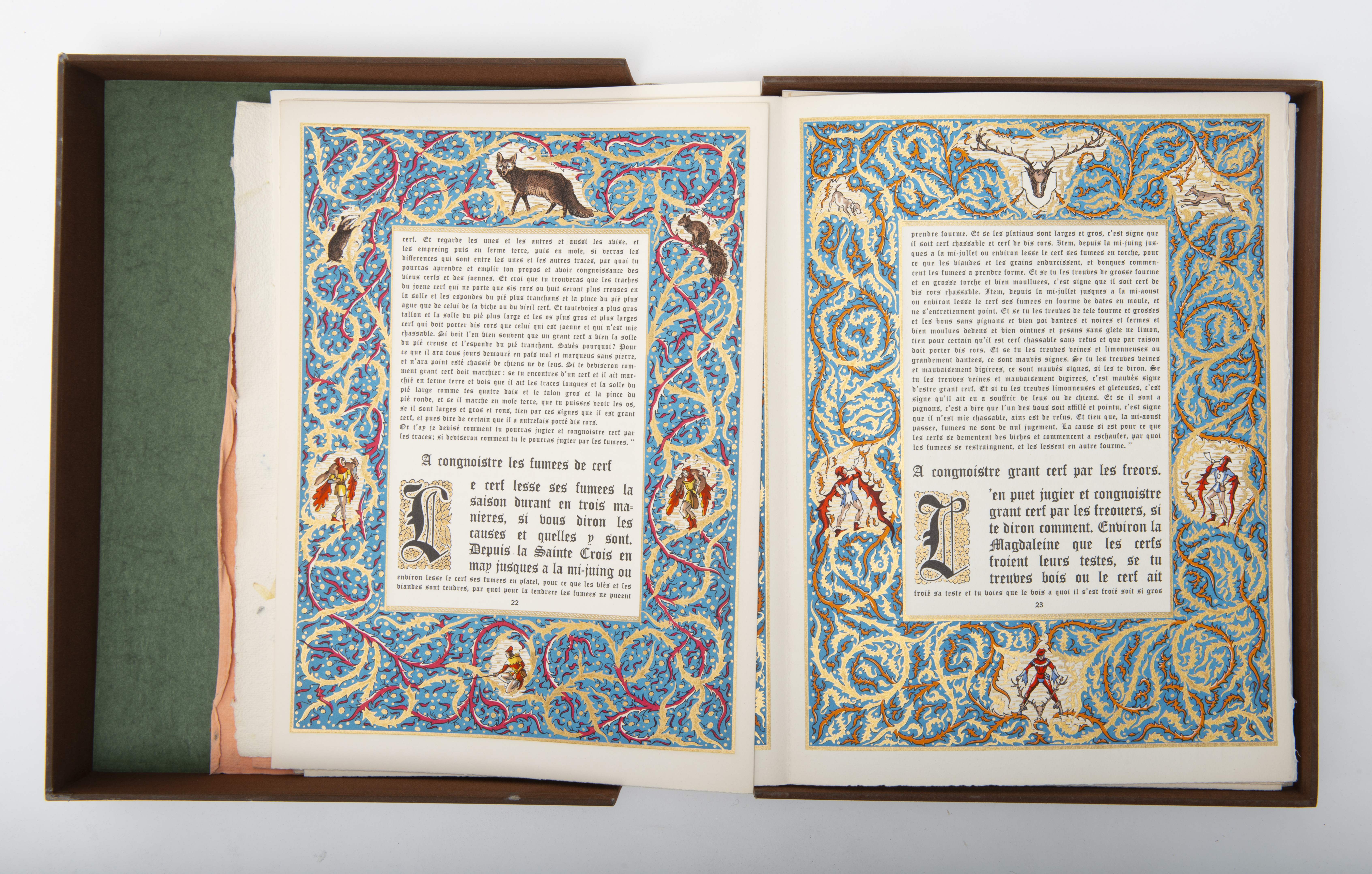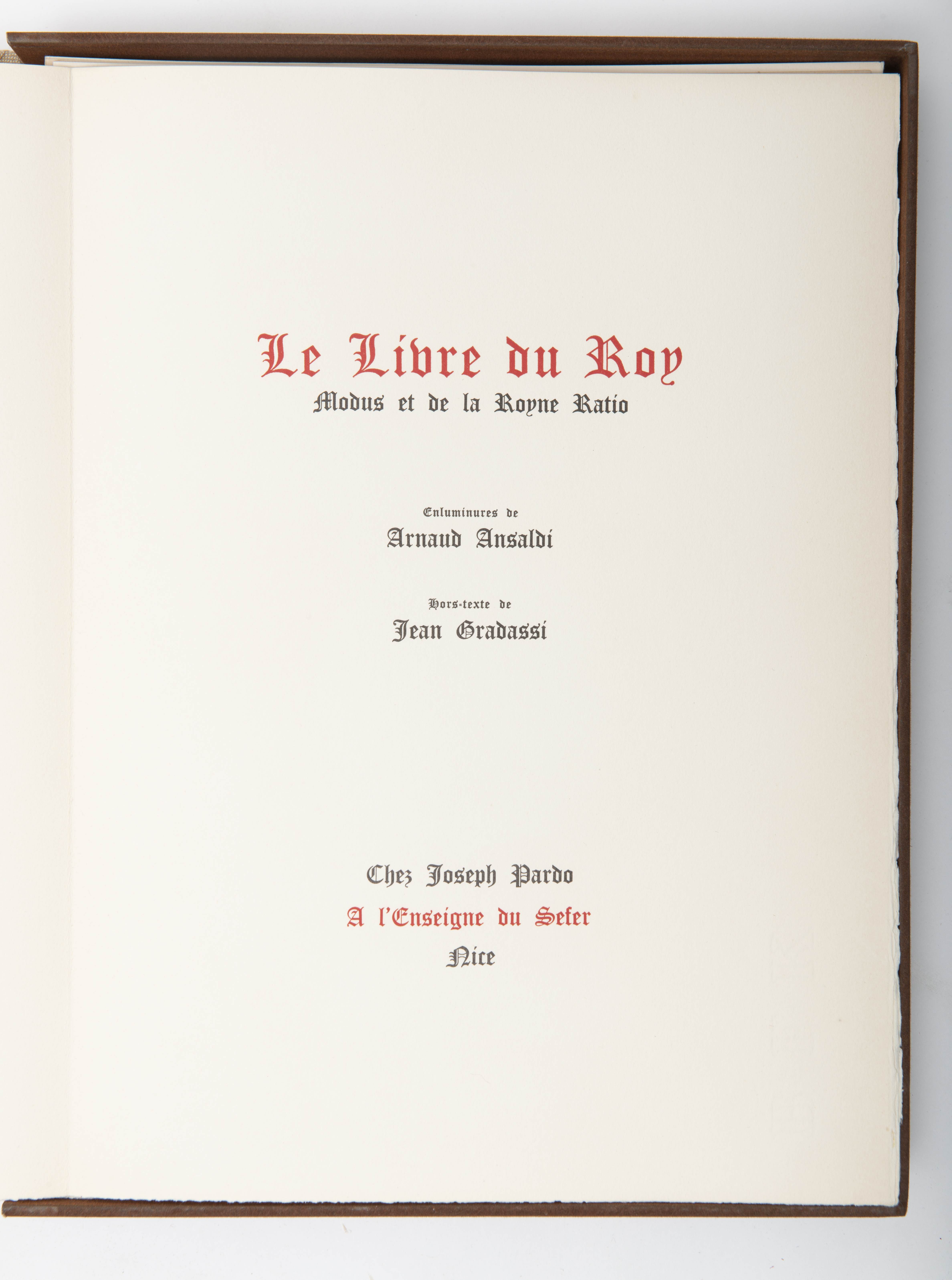 Henry de FERRIERES ,"Le Livre du Roy Modus et de la Reine Ratio", éditeur Joseph Pardo, Editions Artisanales de Sefer, Nice, 1964, ouvrage entièrement orné de décorations de Arnaud ANSALDI et de compositions hors texte de Jean GRADASSI, le tout enluminé en couleurs au pochoir. Un des 750 exemplaire sous étui de grand luxe, N° 907.