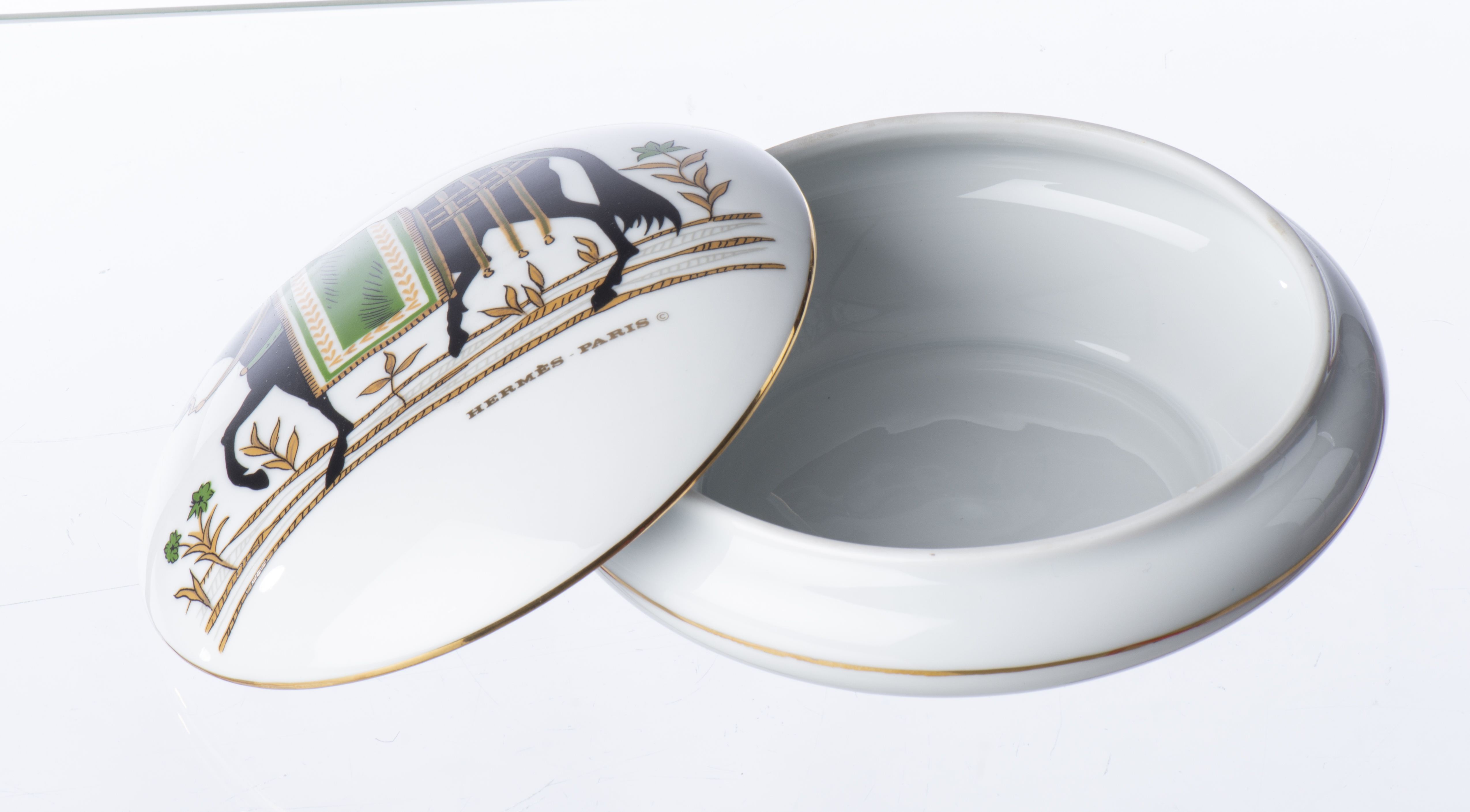 HERMES, Bonbonnière en porcelaine de Limoges à décor d'un cheval