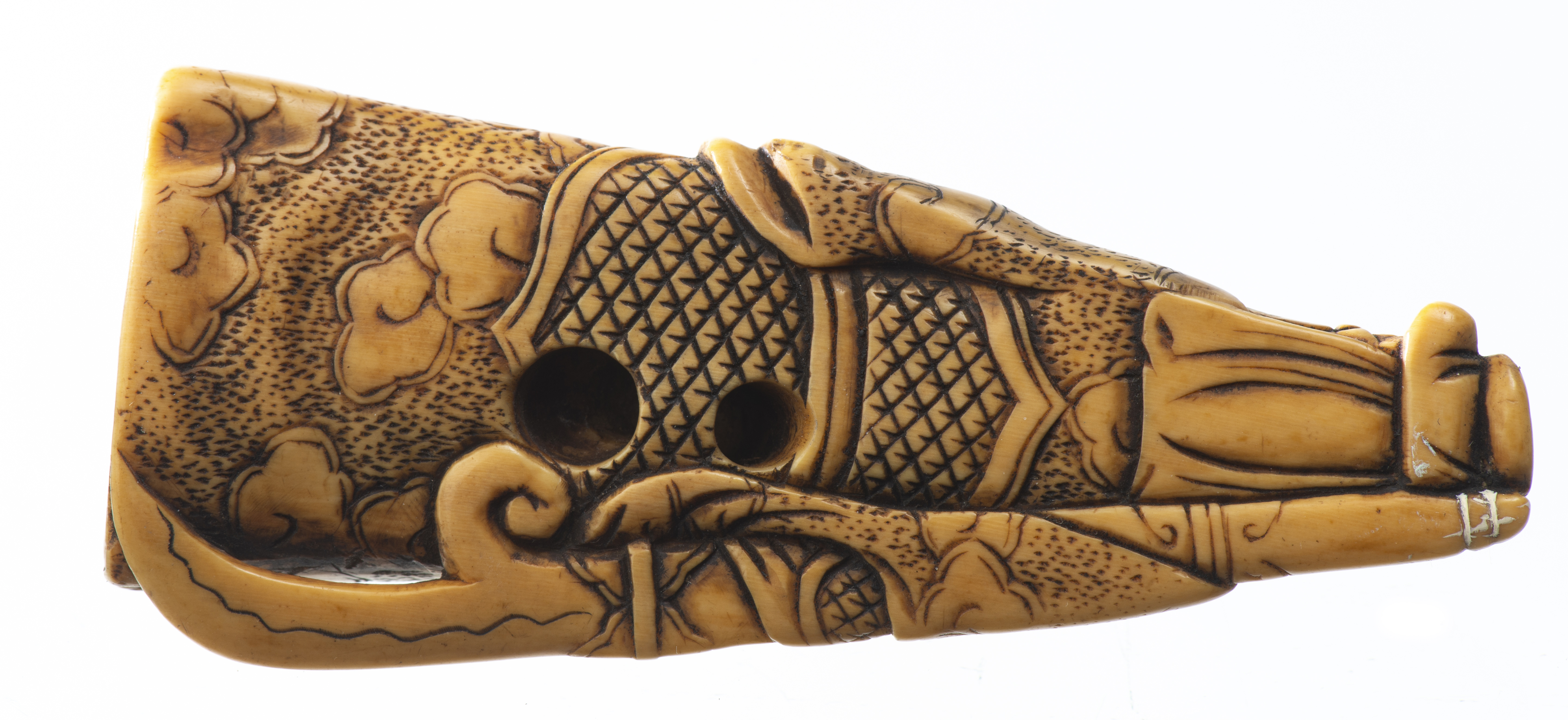 JAPON - XIXe - Netsuke en ivoire représentant Kan'u debout se lissant la barbe.