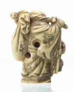 JAPON - Netsuke en ivoire sculpté représentant un personnage portant un sac sur son épaule et un enfant, signé Tomoaki