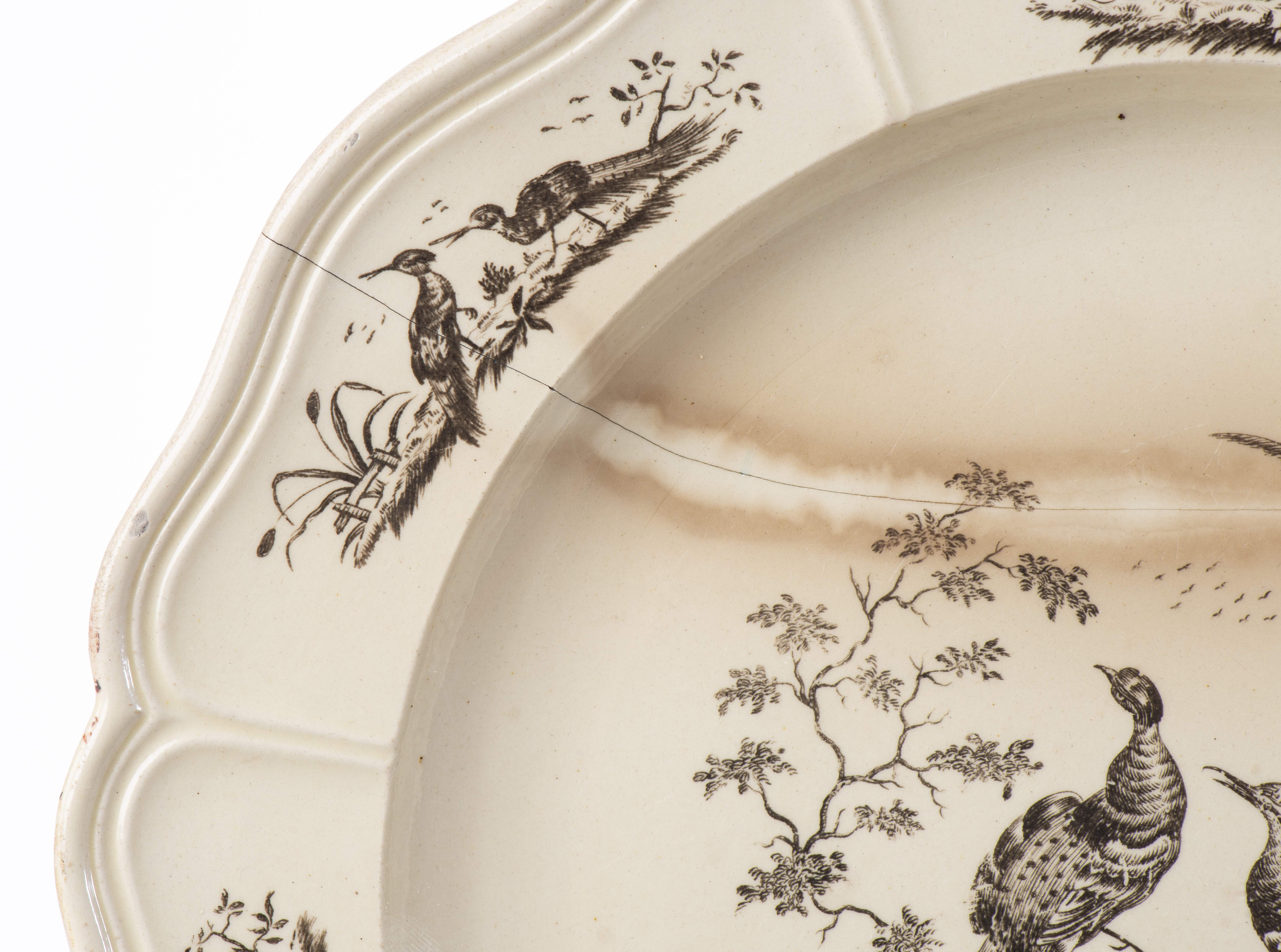 Josiah Wedgwood, 2 assiettes en faïence fine à engobe crème, lèvre mouvementée à motif moulé dit "Queens edge" bordure à la Reine, base sans pied, décor principal de Sadler sur le fond au transfert en noir de 2 paons et oiseaux exotiques dans la campagne appelés "Liverpool Birds" bordure à décor de paons dans la campagne, circa 1765