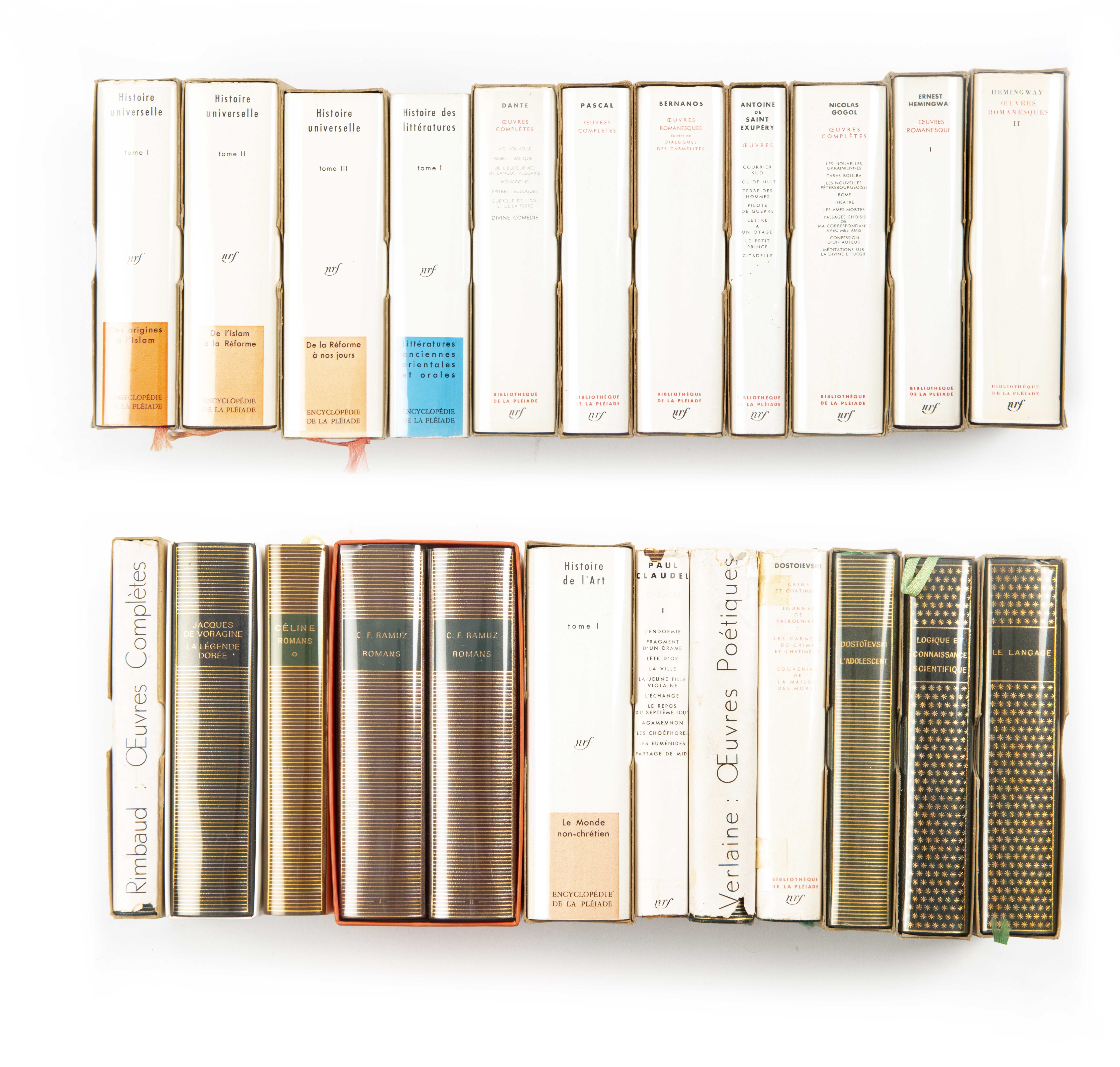 LA PLÉIADE, Collection de 23 volumes In-12, Gallimard, NRF, Bibliothèque de la Pléiade & Encyclopédie de la Pléiade, Paris, édités ou réédités de 1947 à 2005, papier bible, reliures de l'éditeur chagrin brun, vert ou bleu sous rhodoïd et emboîtage en carton pour la plupart.