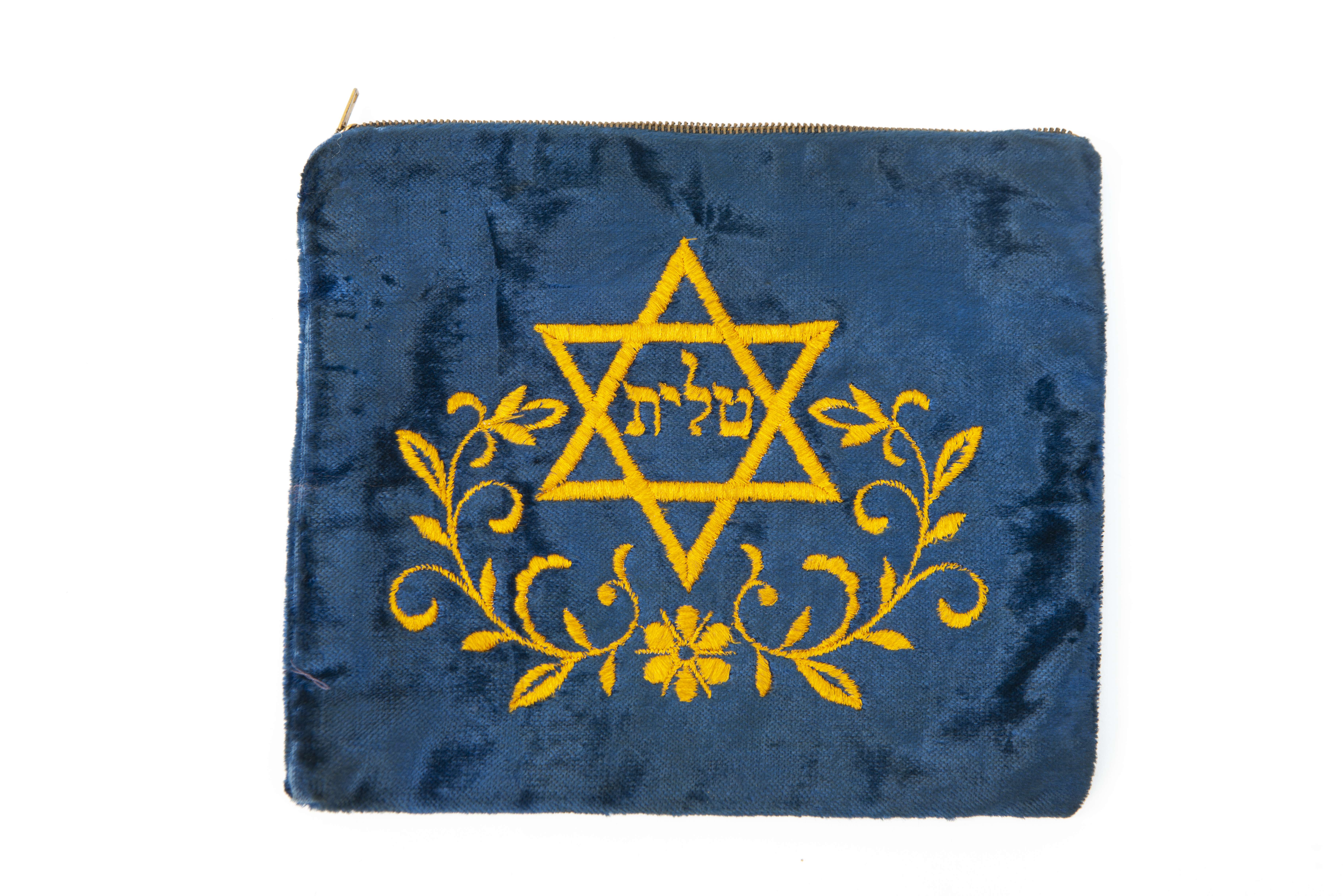 On y joint deux housses pour châle de prière à motifs (dont l'étoile de David) en velours bleu et violet. Poids total: 560 g