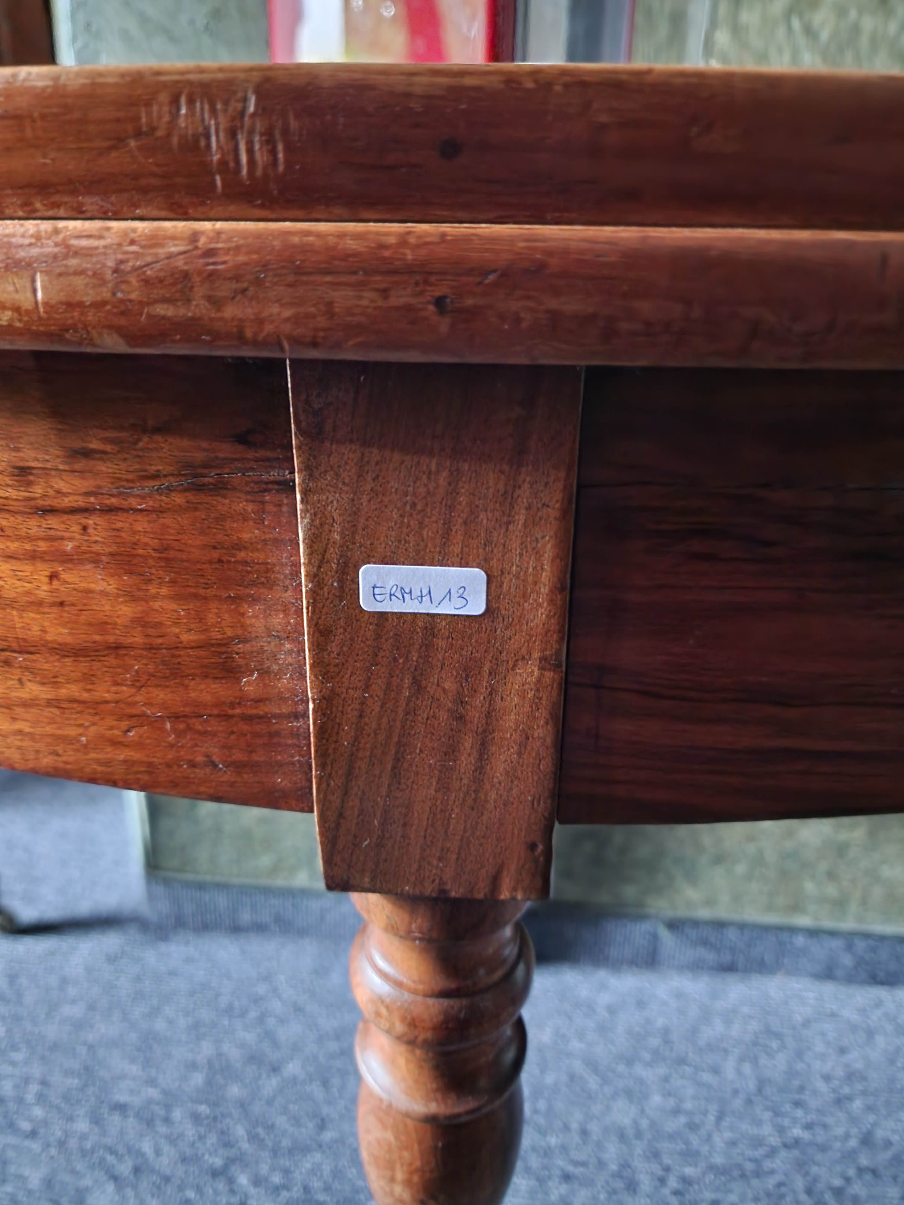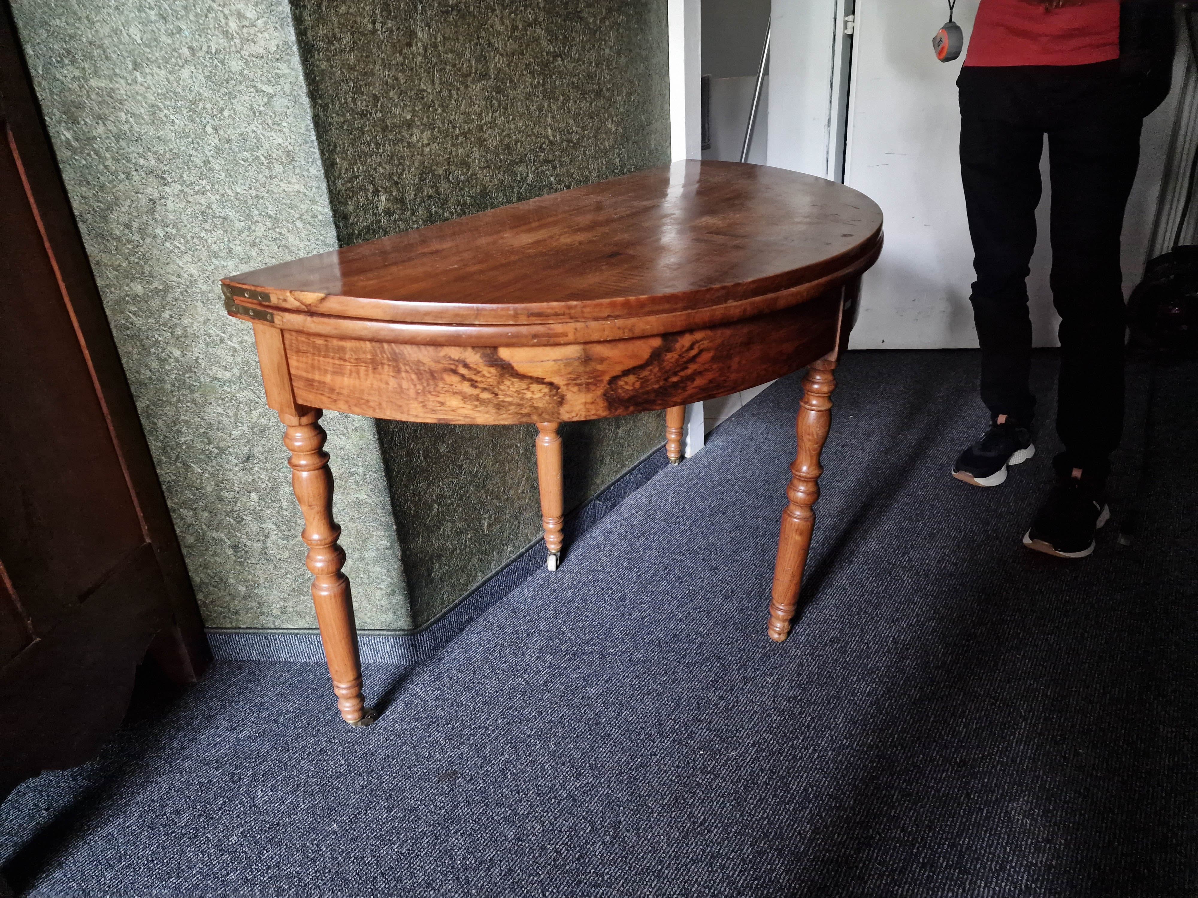 Table demi-lune en bois massif et piètement tripode sur roulettes.