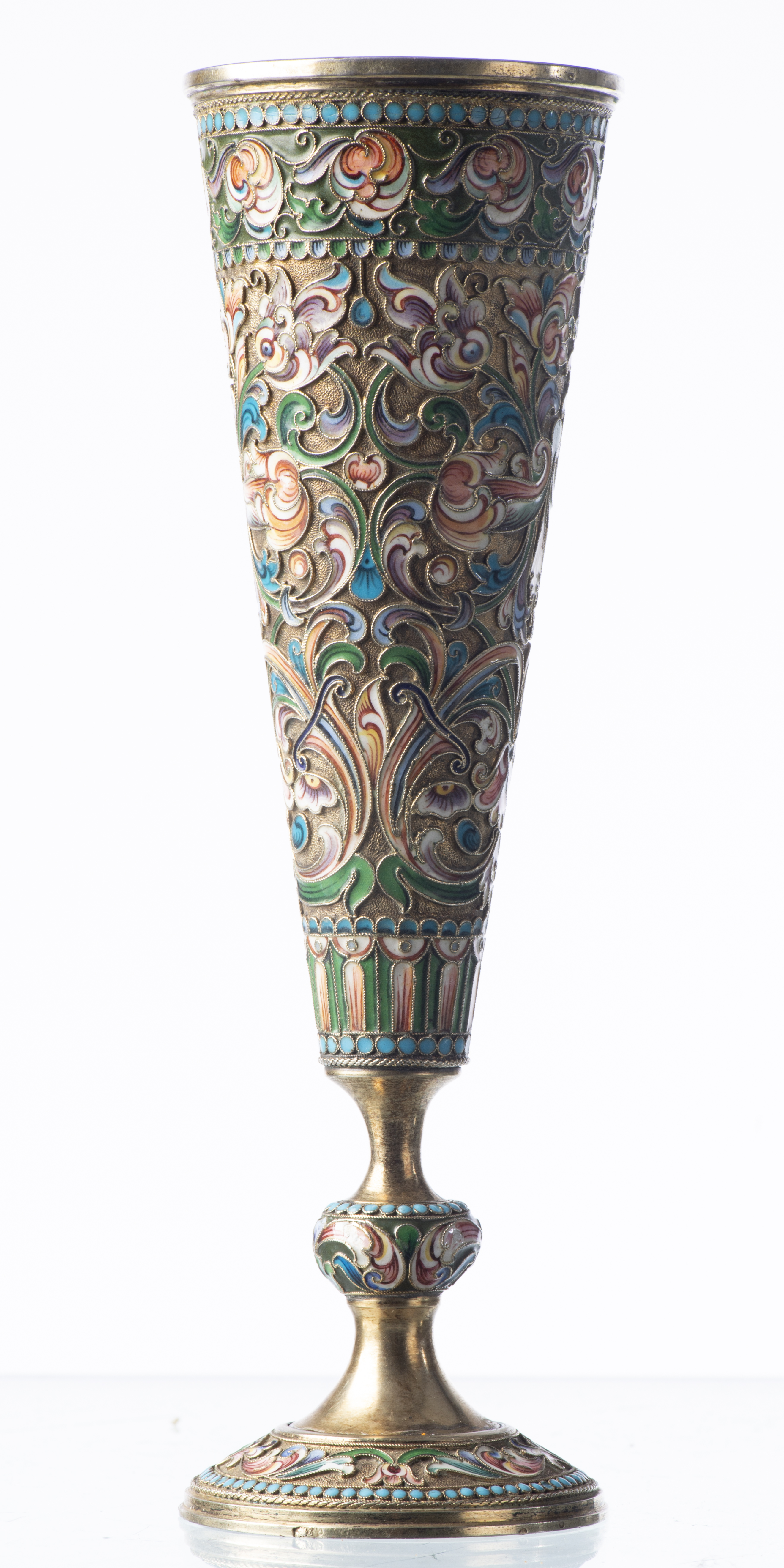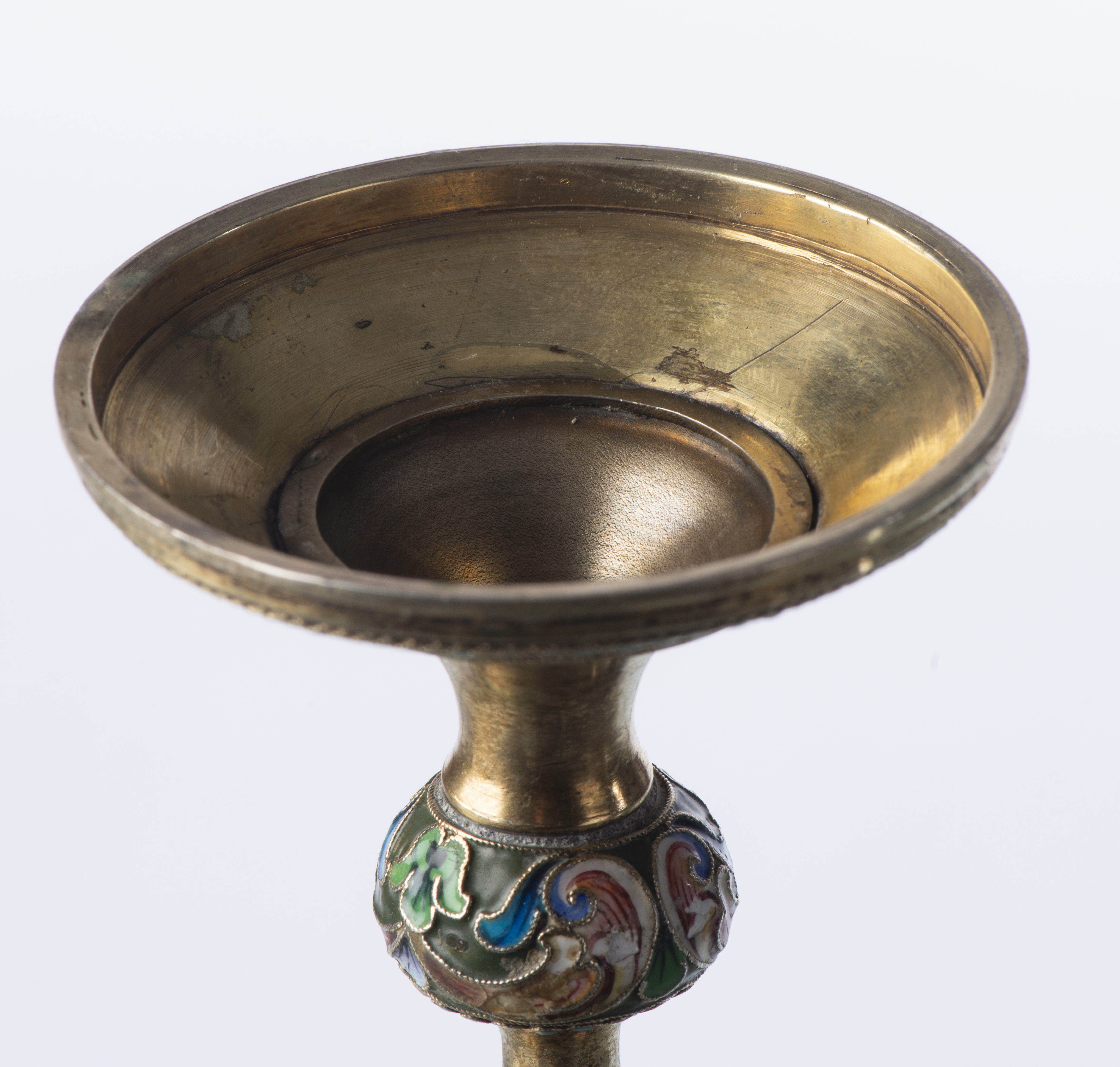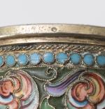 Travail russe XXe - Coupe sur piedouche en argent .875 et vermeil à décor floral en filigrane et email polychrome.