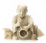 JAPON - Okimono en ivoire, vannier tressant un panier