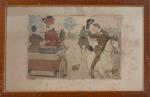Pierre Georges JEANNIOT (1848-1934), "Entrée dans le bois de boulogne", aquatinte en couleur sur papier vergé, signé en bas à gauche, vers 1890.