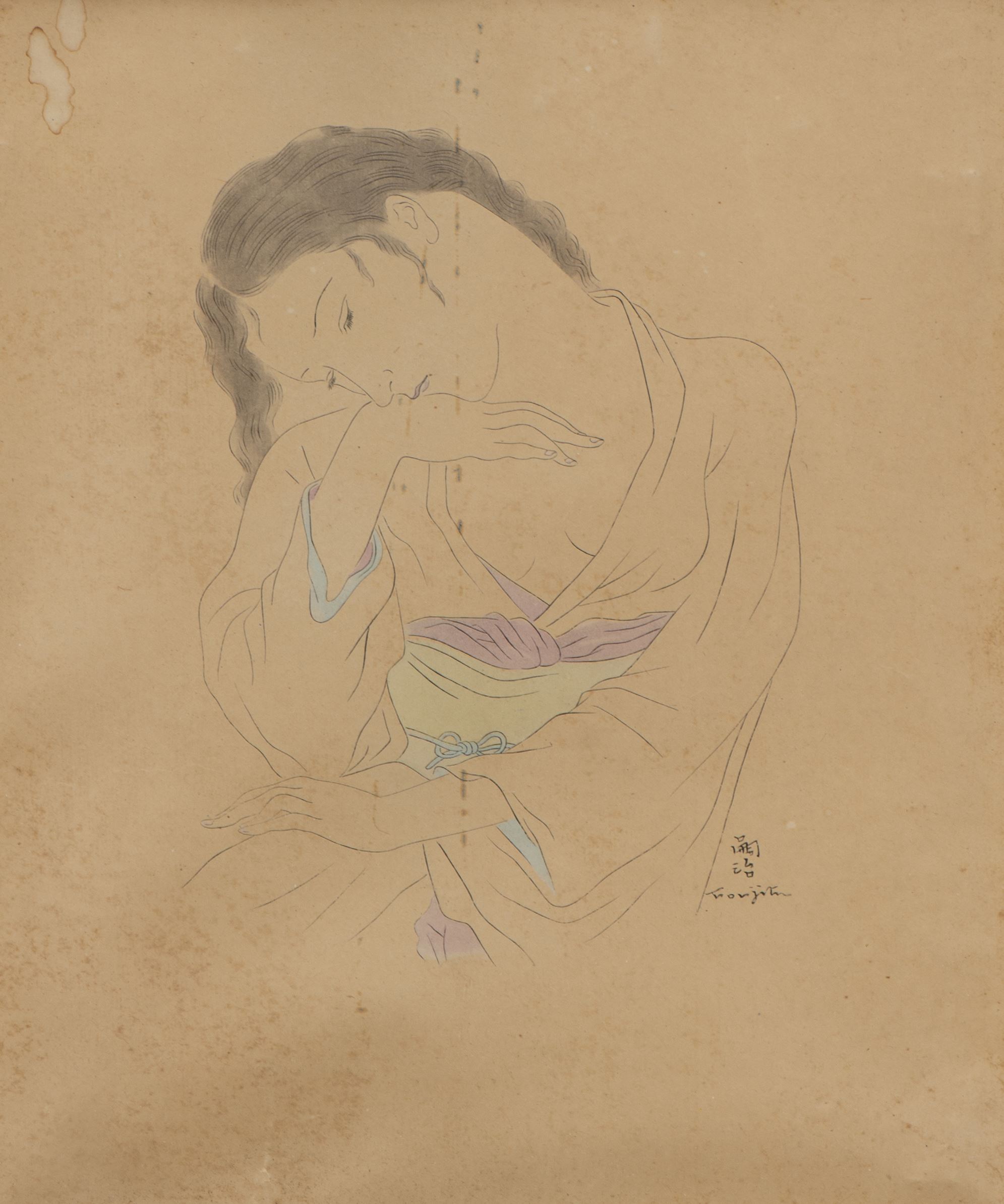 Tsuguharu FOUJITA (1886-1968), "Femme de Paris assise endormie en kimono", pointe sèche à rehauts de couleur, signé en bas à gauche.